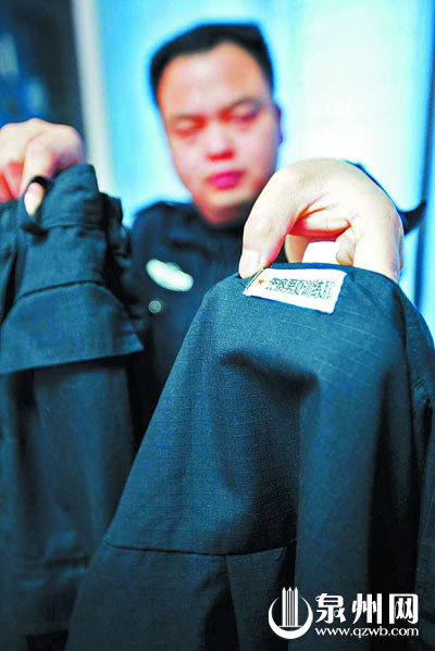 民警展示疑犯穿的警用训练服